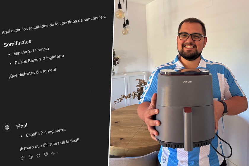 Pero aquel 10 de junio, ChatGPT acertó equipos y resultados para las semifinales (España 2 – 1 Francia, Países Bajos 1 – 2 Inglaterra) y la final (España 2 – 1 Inglaterra) de la Euro 2024, lo que me ha acabado asegurando el primer premio de la porra: una freidora de aire Cosori Turbo Blaze Chef Edition.