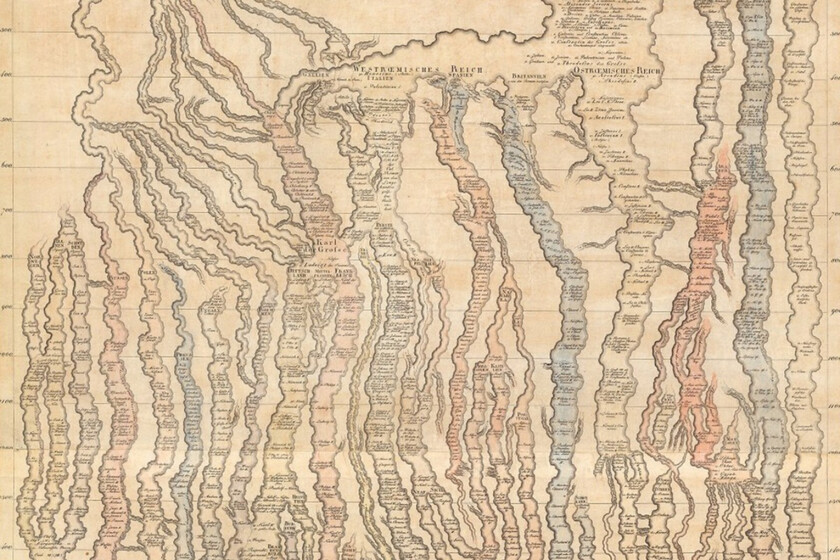 Los afluentes surgen, se unifican y desaparecen conforme avanza el tiempo. La mirada histórica de Strass era esencialmente elitista: enumeraba a los monarcas y dirigentes en función de sus posesiones (Felipe II y Carlos V se convierten en el afluente fluvial más ancho de su época) de forma cronológica. A la derecha quedan encalladas las civilizaciones asiáticas. Otras, como las africanas o las americanas, ni siquiera figuran.