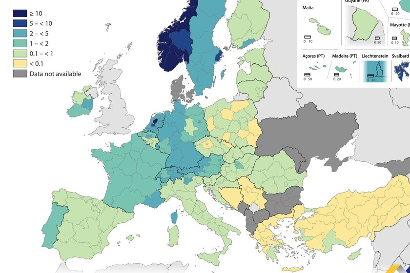 Esto mismo se replica fuera de España. En Italia se observa una clara diferencia entre el norte (donde se encuentran las únicas tres regiones en las que se supera el 1%) y Alemania, donde el oeste cuenta con una mayor adopción del coche eléctrico que en el este. En el mapa general, conforme se avanza hacia el este, los tonos verdes dejan paso al amarillo (<0,1%).