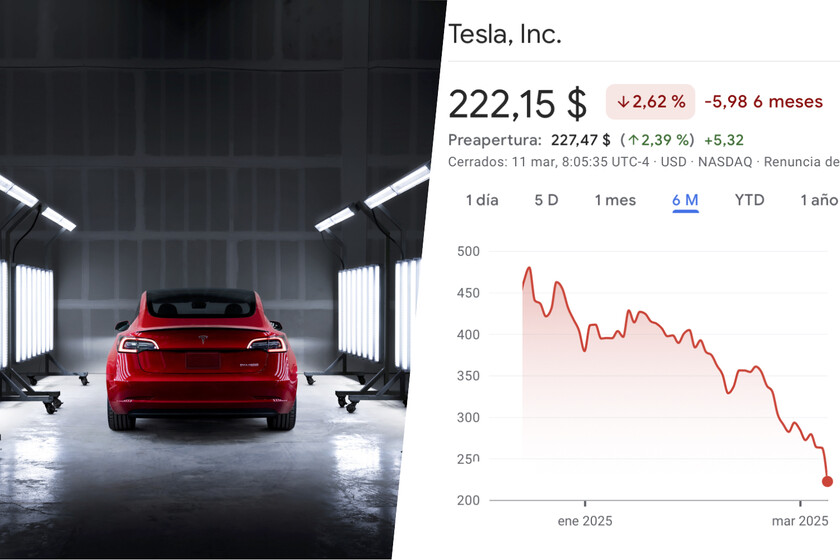 Cuando escribimos estas líneas, una acción de Tesla cuesta 222 dólares. La cifra ya es inferior a la registrada el 5 de noviembre de 2024, día en el que se celebraron las elecciones de Estados Unidos. Y está muy cerca de igualar los 213 dólares que costaba una acción a finales del mes de octubre, la cifra más baja en los últimos seis meses.